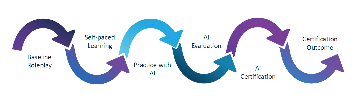 We started with baseline performance assessments, measuring each associate’s sales skills through initial AI simulations. The learning flow created a continuous improvement cycle: baseline assessment, self-paced learning modules, AI practice sessions, evaluation, certification attempts, and outcome analysis.